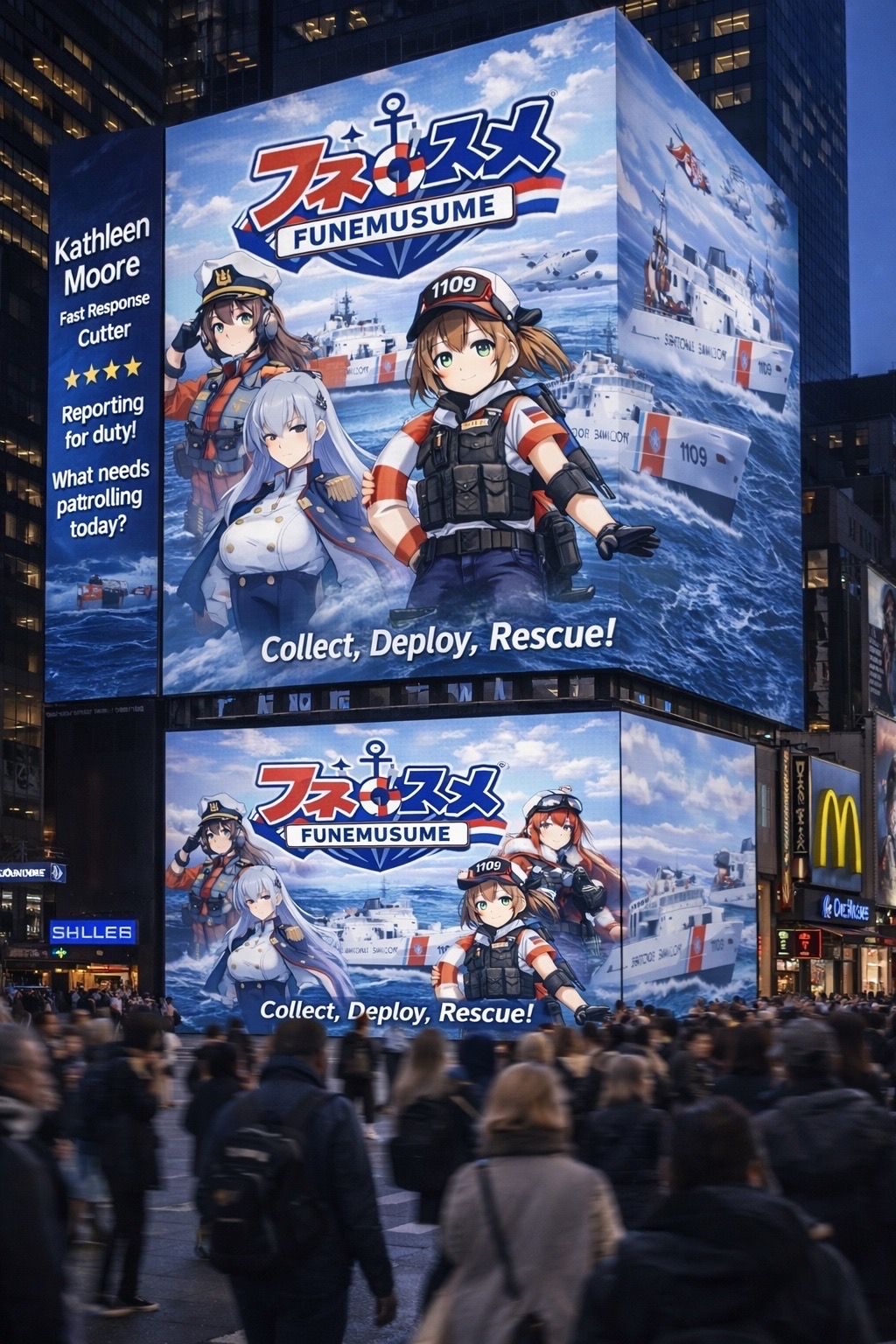 High-Impact Advertising: Using the last remnants of the Coast Guard's marketing budget, a Funemusume advertisement announced the game at Times Square on April 1st.